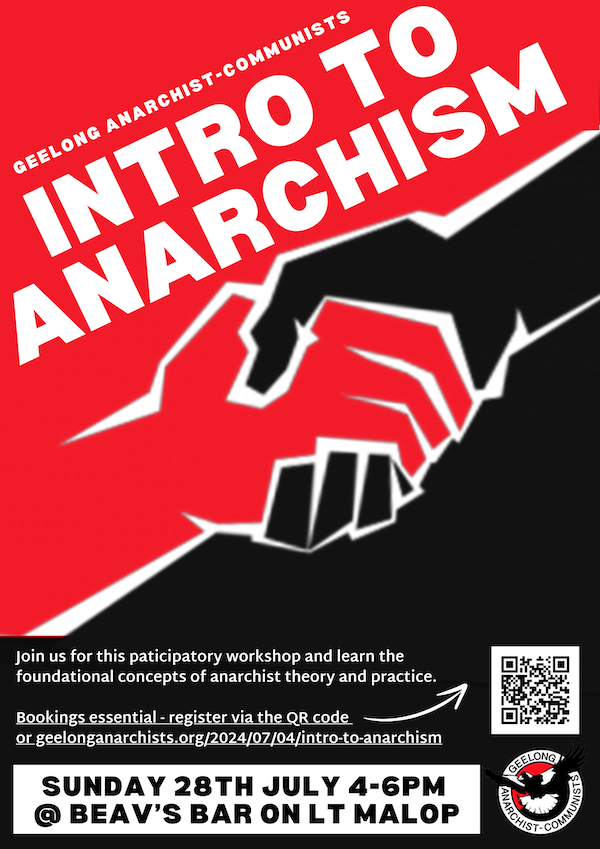 Join us for our Introduction to Anarchism workshop on Sunday, July 28th, from 4pm at Beav’s Bar, 123 Little Malop St, Geelong.